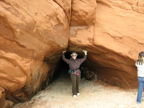 Hilda de Vilda holding up the ceiling of a redstone cave in Les Iles de la Madeleine